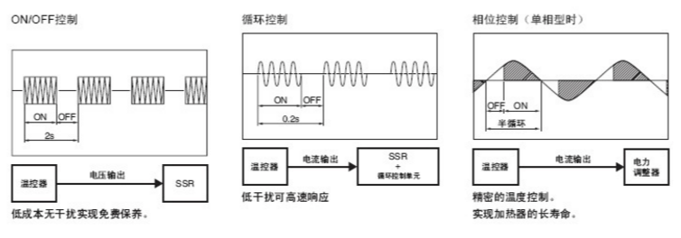控制、循環控制、 相位控制)  ON/OFF控制接受溫控器的電壓輸出信 號, 通過開關SSR來控制加熱器的 ON/OFF。在電磁繼電器中也可進行相同 的控制, 但是以數秒間隔控制ON/OFF, 使用數年時需要SSR。  循環控制(G32A-EA) 以0.2秒(固定) 為 控制周期。其方式是使其在0.2秒內 ON/OFF, 從而控制輸出電力。  接受溫控器的電流輸出4~20mA來控制。