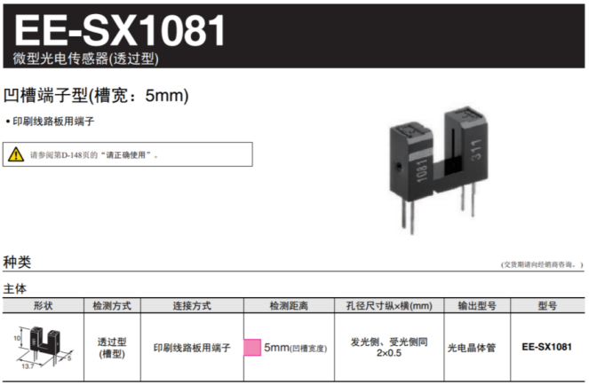 EE-SX1081 是一款透射式光電傳感器, PCB安裝。光電傳感器是一種緊湊型光學傳感器, 可通過光束感應物體的位置。通用型號帶有5mm寬槽。高分辨率0.5mm寬孔徑, 光電晶體管傳感器輸出。透射式光電傳感器包含發(fā)射器和檢測器, 面對對方, 當物體位于發(fā)射器和檢測器之間, 物體會攔截發(fā)射器的光束, 從而減少檢測器接受的光信號。-25至85°C 工作溫度范圍