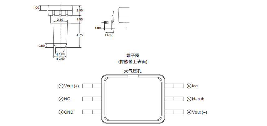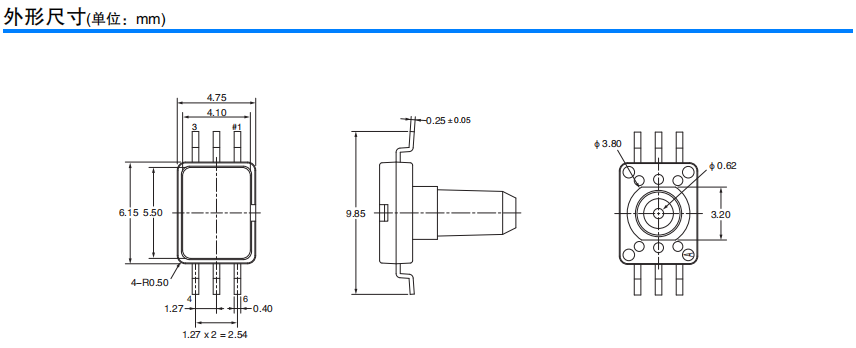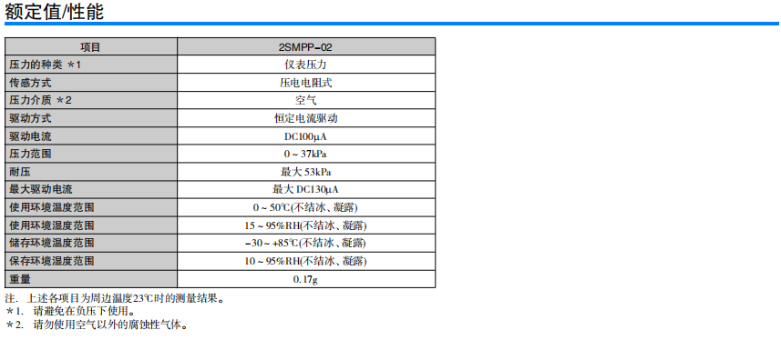 超小型、低功耗的MEMS表壓傳感器 長6.1mm×寬4.7mm×高8.2mm的超小型。 比電容式壓力傳感器更優異的電氣特性。 測量壓力范圍為0~37kPa。 偏置電壓:-2.5±4mV 量程電壓:31.0±3.1mV 0.2mW的低功耗。 受溫度影響小。 量程電壓:±1.0 %F.S. 偏置電壓:±3.0%F.S.